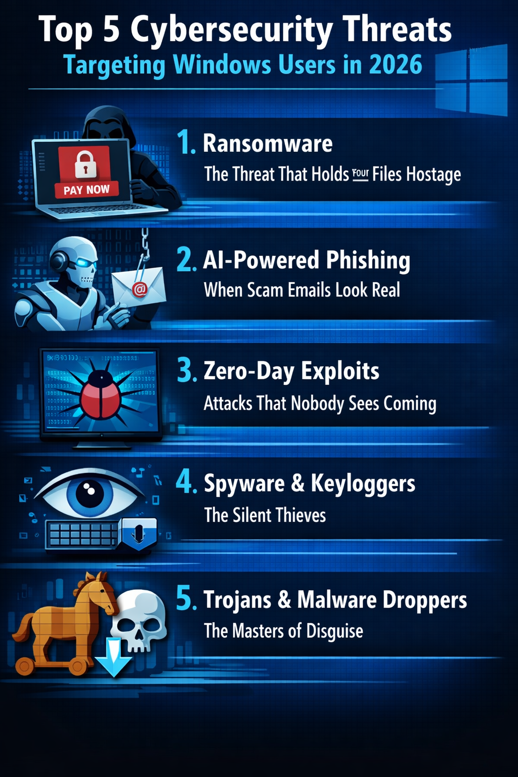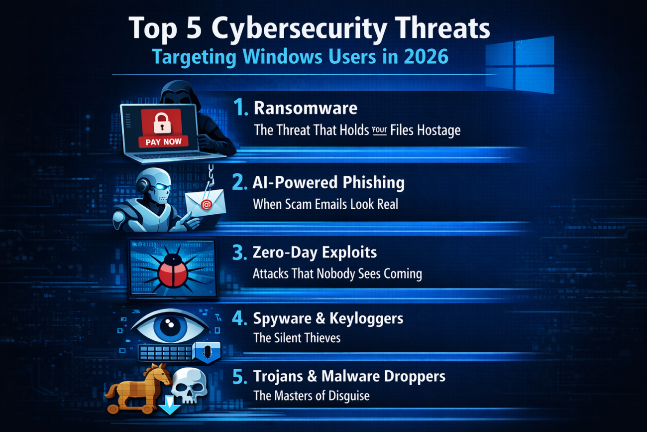 Whether you are a student, a working professional, a small business owner, or someone who just uses a PC at home – this blog is for you. No technical jargon. No scare tactics. Just a clear, honest breakdown of the top 5 cybersecurity threats targeting Windows users in 2026, and what actually works to stop them.